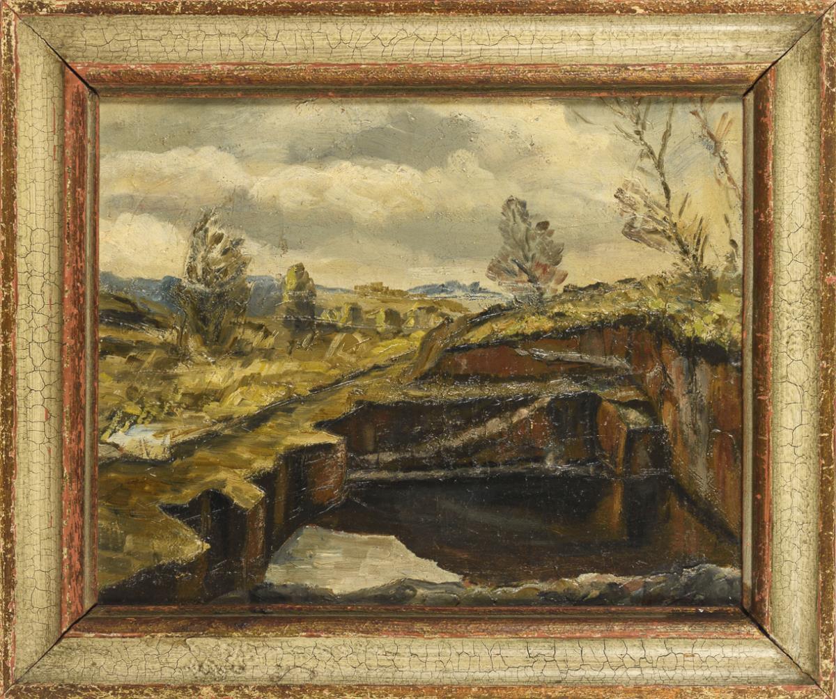 Blick über die Grube in der herbstlichen Landschaft unter grauem Himmel. Leichte Altersspuren.