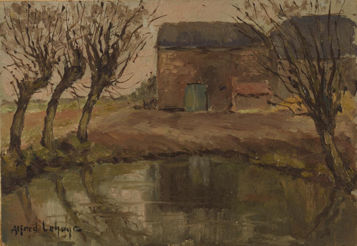Landschaft mit Flussufer nahe Wald sowie Bauernhaus mit Teich im Vorfrühling.