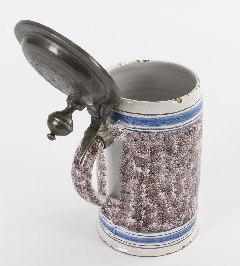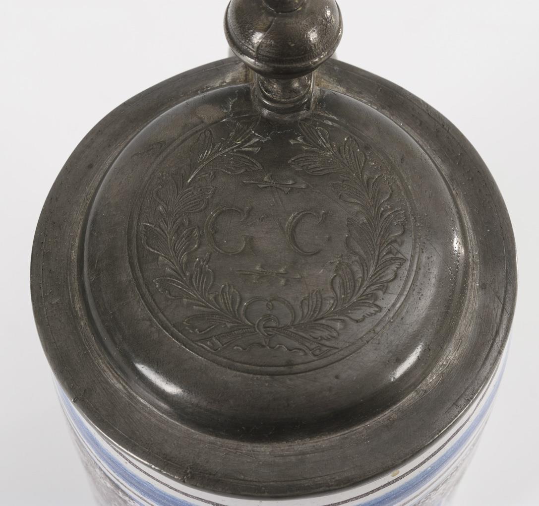 Zylinderkrug mit manganjaspierter Wandung und Bandhenkel. Schauseitige Barockreserve mit Figurendarstellung. Gravierter Zinndeckel mit Kugeldrücker, monogrammiert "GC". An den Rändern mit Bestoßungen.