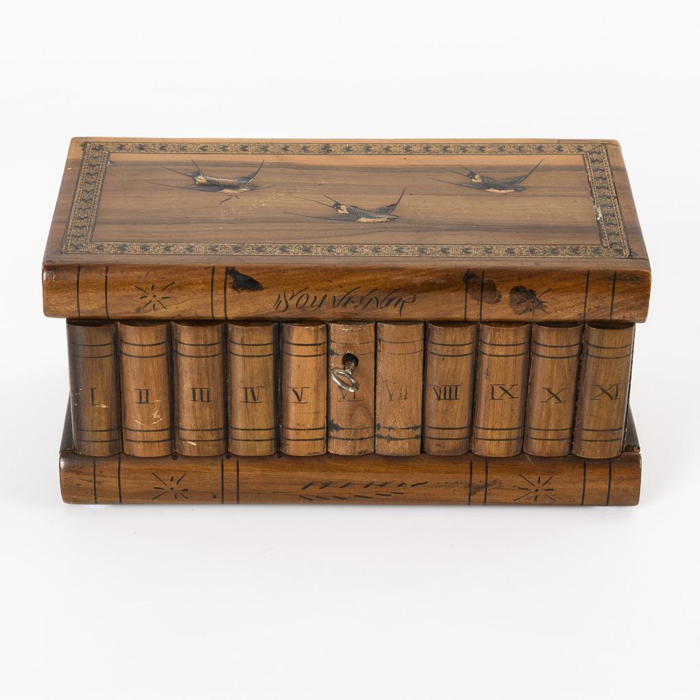 Schatulle in Form von Büchern. Auf dem Deckel Schwalben in der Scheinkassette sowie Schrift "Souvenier", im Boden ein Geheimfach; innen roter Samt. Einige Alters-/Gebrauchsspuren, Schlüssel ergänzt.