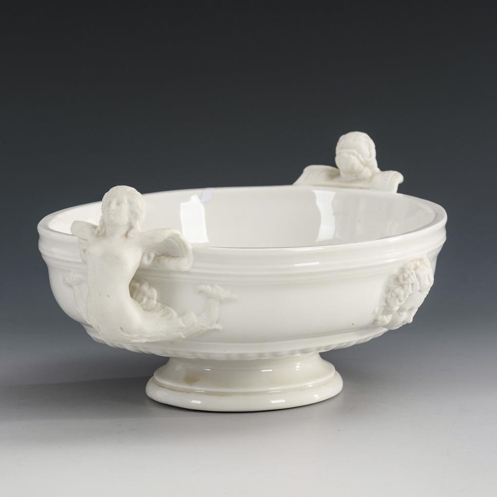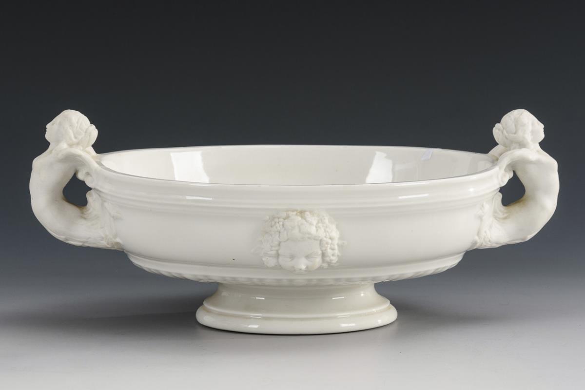 Ovale Schale mit Biskuit-Harpyienhandhaben und Biskuitmaskaronen.