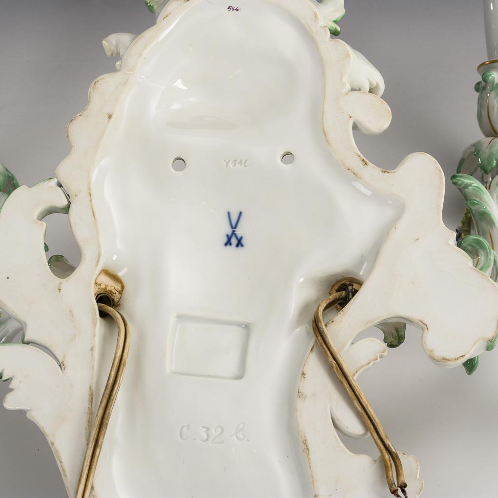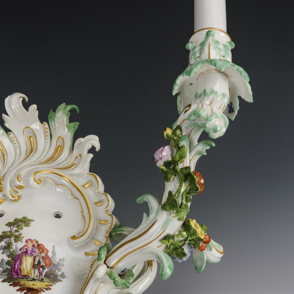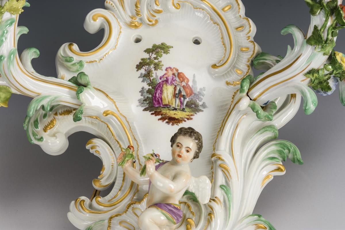 Rocailleschild mit blumentragendem Putto und Watteau-Malerei, aus dem Wandschild hervorwachsend zwei eingesteckte und blütenbelegte Rocailleleuchterarme mit elektrischen Kerzentüllen. 1 Blatt eines Tropftellers lose anbei, Blüten partiell minimal bestoßen, 1 Leuchterarm mit Haarriss.
