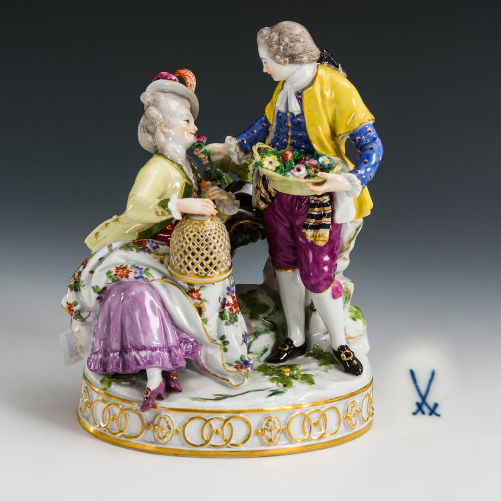 Sitzende Gärtnerin mit Vogelbauer, zu ihrer Linken ein Gärtner mit Blumenkorb stehend. Rechter Fuß der Dame restauriert.