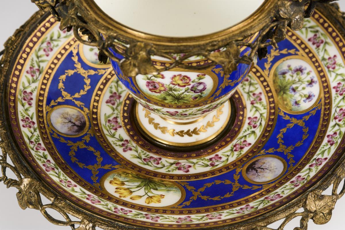 Gefußte Glockentasse und Untertasse mit Rundfuß. Blauer Teilfond mit goldenen Blattranken und Medaillons mit feiner Blumen- und Landschaftsmalerei. Die beiden Henkel der ursprünglichen Doppelhenkeltasse fehlen, an deren Stelle wurde die Tasse und Untertasse mit einer fein gearbeiteten Bronzemontierung in Form von Efeuranken versehen. Minimaler Goldabrieb im Untertassenspiegel.