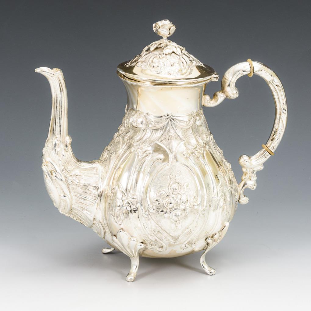 Schwere silberne Kaffeekanne mit Rosendekor.