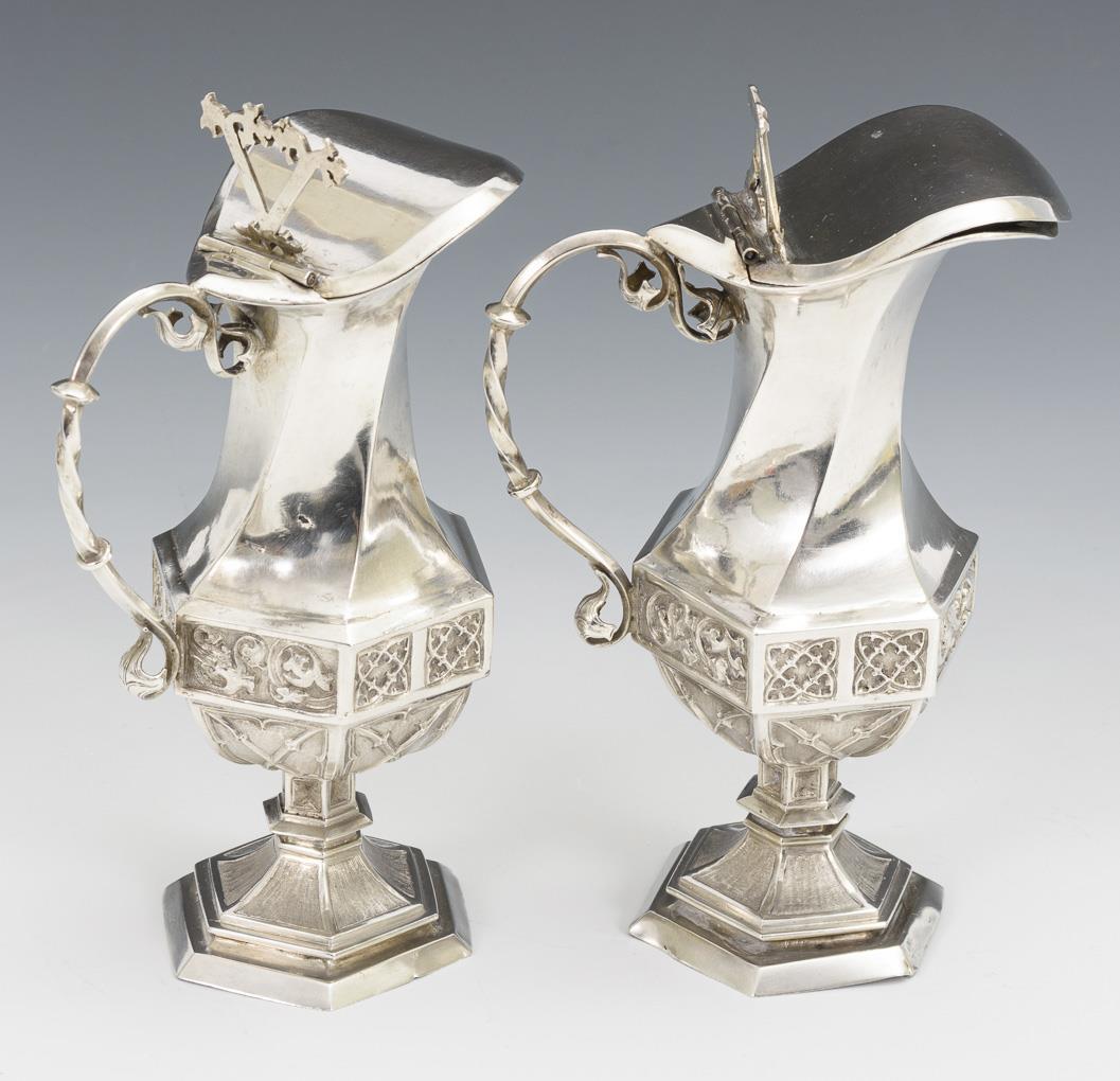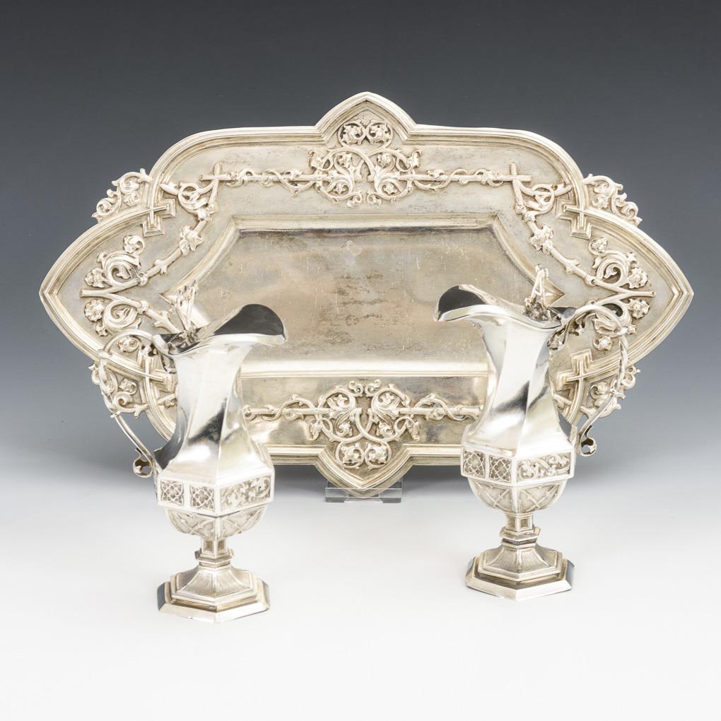 Im neogotischen Stil gestaltet. 2 Deckelkännchen für Wasser und Wein mit "A" und "V" als Drücker. Auf reich verziertem Tablett. Gebrauchsspuren, kleine Dellen.