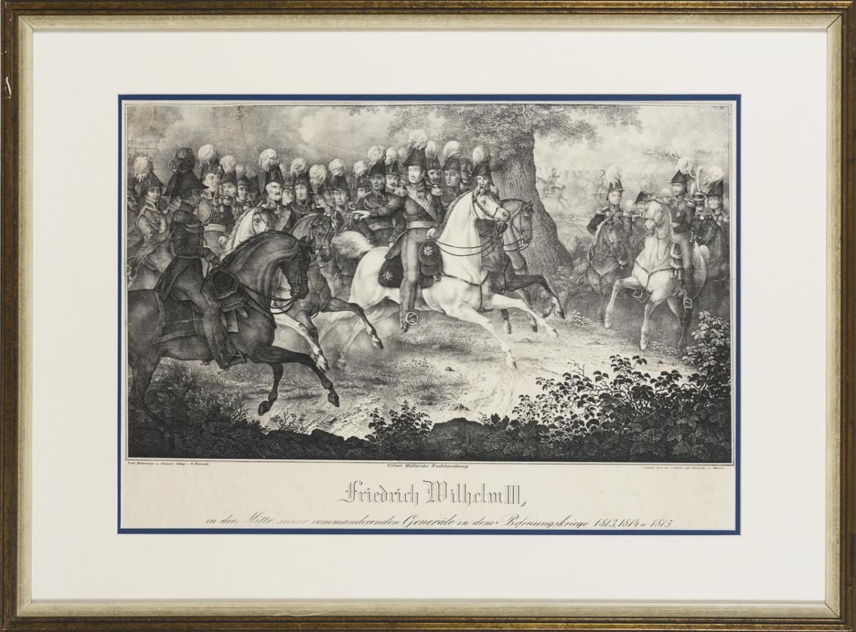 Militärische Szene anlässlich der Befreiungskriege von 1813 bis 1815 zur Beendigung der Vorherrschaft Frankreichs unter Napoleon Bonaparte, bezeichnet "Friedrich Wilhelm III. in der Mitte seiner commandirenden Generäle in dem Befreiungskriege 1813, 1814 u. 1815".