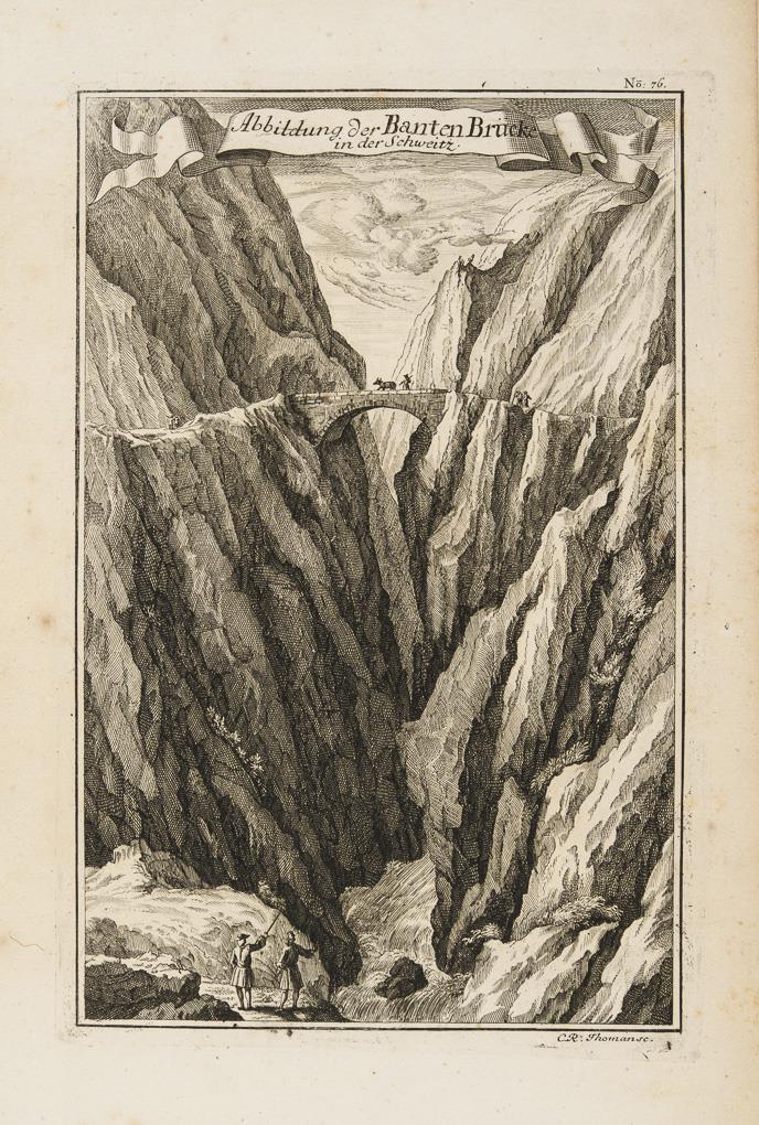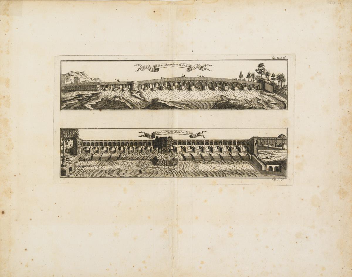 No. 82: "Brücke von Loyano in der Sinesischen Provinz Fockien" | Nr. 76: "Abbildung der Banten-Brücke in der Schweitz" (gestochen von Christoph Raimund Thoman von Hagelstein) | No. 85 und 86: "Brücke Maranbuun in Persien" und "Brücke Hassen Abaad in Persien" (1 Platte), aus: Carl Christian Schramms "Historischer Schauplatz, in welchem die Merkwürdigsten Brücken aus allen vier Theilen der Welt, Insonderheit aber Die in den vollkommensten Stand versetzte Dreßdner Elb-Brücke, In saubern Prospecten, Münzen und andern Kupferstichen vorgestellet und beschrieben werden", 1735. Je stark stockfleckig.