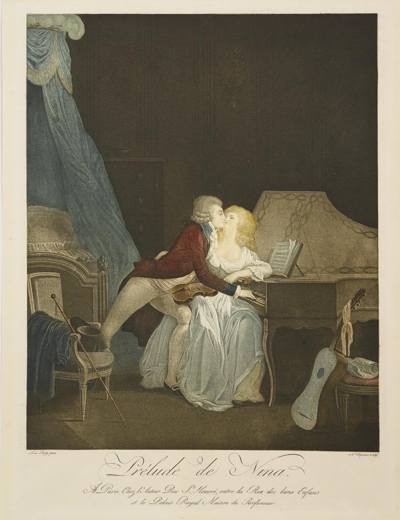 Erotische Genreszene mit innig umschlungenem Paar, an einem Flügel sitzend, bezeichnet "Prélude de Nina. A Paris, Chez l'Auteur Rue St. Honoré, entre la Rue des bons Enfans et le Palais Royal Maison du Parfumeur", nach einem Gemälde von Louis Boilly (1761 - 1845). Etwas griffspurig, minimal stockfleckig.
