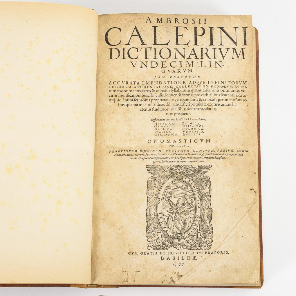 Wörterbuch lateinischer Wörter, übersetzt in Hebräisch, Griechisch, Französisch, Italienisch, Deutsch, Belgisch, Spanisch, Polnisch, Ungarisch, Englisch. Jünger in Halbleder nachgebunden und dadurch etwas beschnitten. Titelblatt, (6), 782 Seiten, sowie 783-1582 Seiten und "Onomasticon Propriorum nominum, primum" von Conrado Gesnero, ex variis Dictionariis collectum. 302 Seiten. Block mit schwachen Wasserflecken, auf den ersten Seiten minimale Fraßspuren, für das Alter sehr guter Zustand.