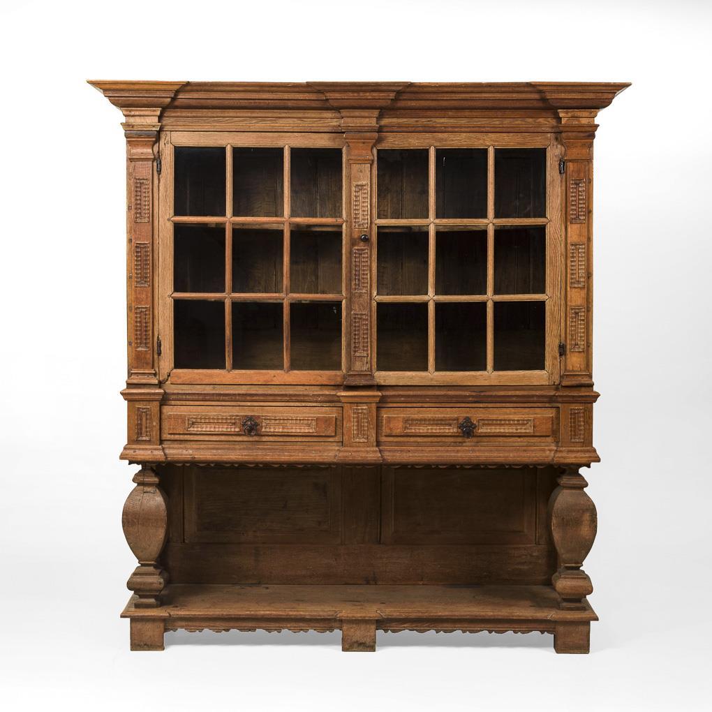 2-türiger Vitrinenschrank mit glattem Gesims und 2 Schüben, Unterteil mit kassettierter Rückwand, 2 vorderen Balusterbeinen und Sockelbrett mit Stollenfüßen. Versprosst-verglaster Aufsatz mit geometrischem Schnitzdekor; innen mit 2 dekorativ geschwungenen Einlegeböden. Alters-/Gebrauchsspuren.