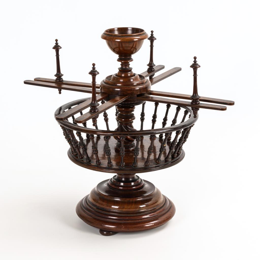 Kunstvoll gedrechselter Ständer mit beschwertem Rundfuß, Korb mit gedrechselten Balustern sowie verstellbare Haspel mit bekrönender Schale.
