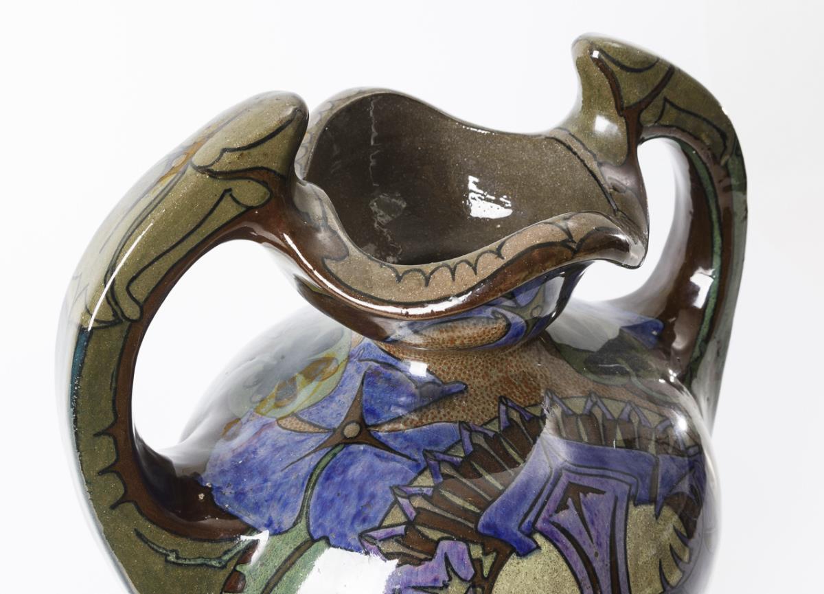 Große Jugendstil-Henkelvase mit Disteldekor.
