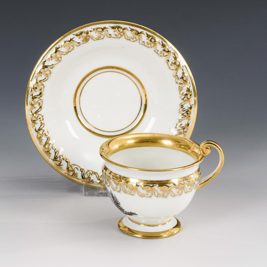 Schwarzes Dekor, Goldstaffage. H Tasse 7,5 cm, Ø originale Untertasse 14 cm.