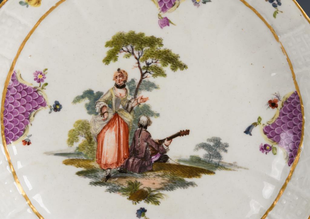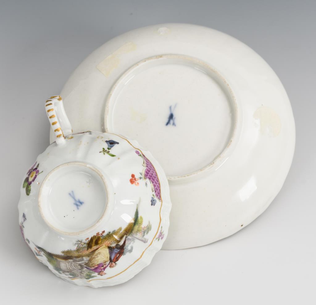 Form "Neubrandenstein". Schauseitig auf der Tasse sowie im Spiegel der Untertasse eine galante Szene, purpurfarbene Mosaikzwickel, Streublümchen. Etwas grauer Scherben.