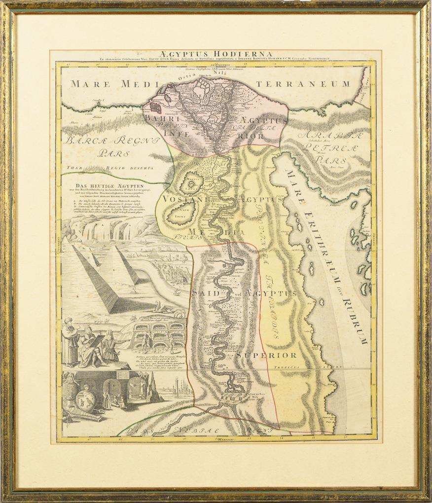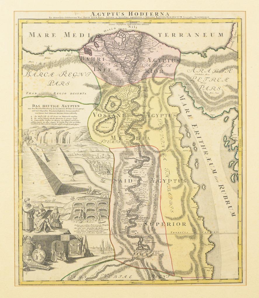 Karte des Nillaufes von den Katarakten des Mittellaufes bis zur Mündung, Titelkartusche "Aegyptus Hodierna - Das heutige Ägypten aus der Reyßbeschreibung des berühmten Hr. Paul Lucas gezogen und mit folgenden Denckwürdigkeiten herausgegeben [...]", im linken Bereich mit figurativen Ansichten der Nil-Wasserfälle, Pyramiden, antiken Gefäßen, Grüften und Brut-Öfen. Stockfleckig, horizontale Bugfalte.