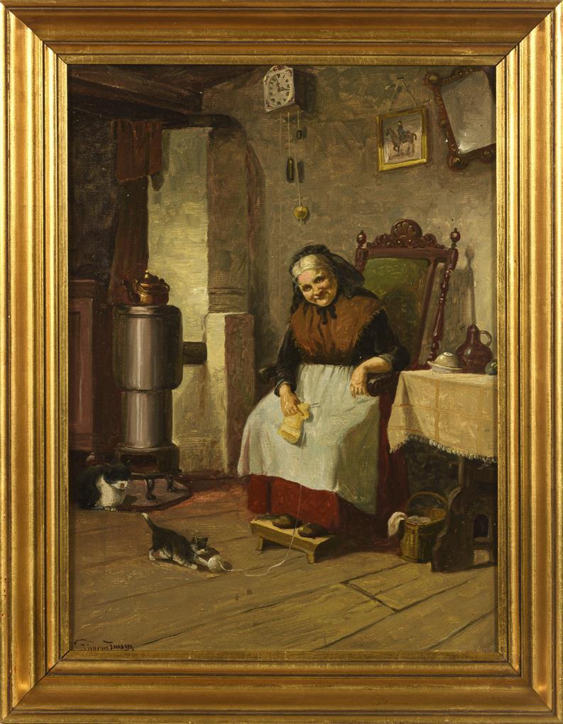 Bildnis einer alten, zufrieden lächelnden Frau beim Stricken, während die Katze mit dem Wollknäuel spielt. Leichte Altersspuren.