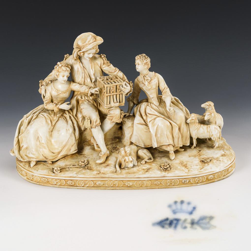 Auf einem Steinsockel sitzendes Schäferpaar mit Vogelbauer sowie eine junge Dame mit Schafen. 1 Schafohr fehlt, 1 Schleife restauriert.