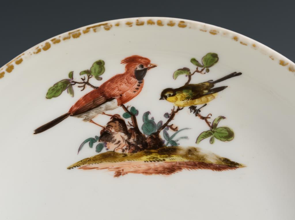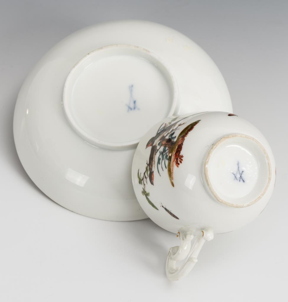 Polychrom bemalt, goldstaffiert.H Tasse 6,5 cm, Ø originale Untertasse 13,5 cm.