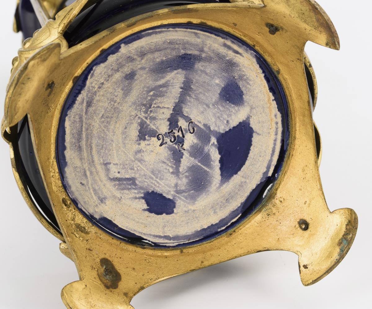 Stangenvase mit nodierter Mündung und Stand. Floral reliefierte Bronzemontierung mit 2 Handhaben und 4 Füßen, graviert "2. Preis, Kegelklub "Drehstrom" 1908". Kleine Glasurchips an Mündungsrand und Wandung, Bronze mit Altersspuren.