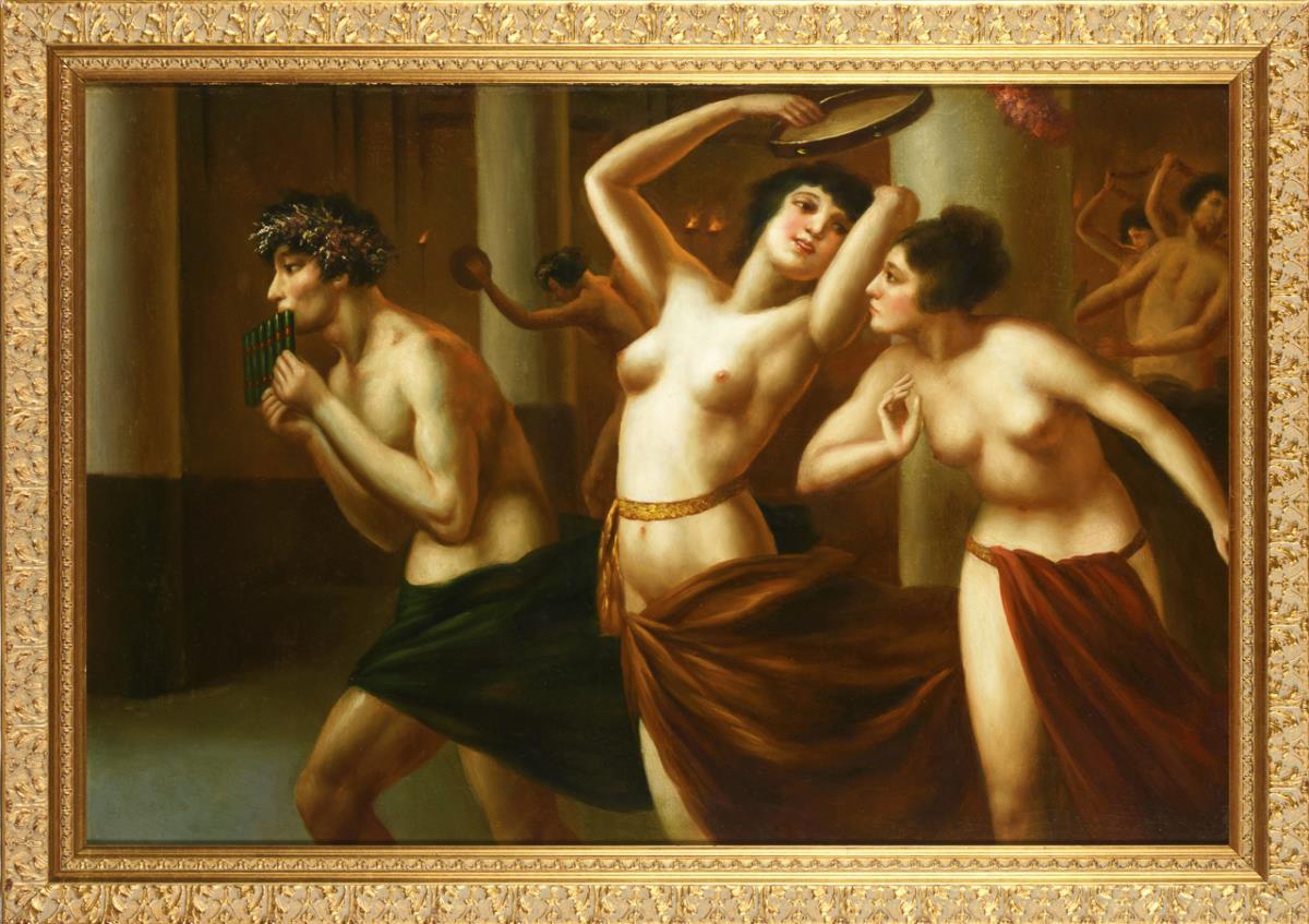 Tanzende und feiernde nackte Frauen und Männer mit Musikinstrumenten zwischen Säulen. Leinwand doubliert.