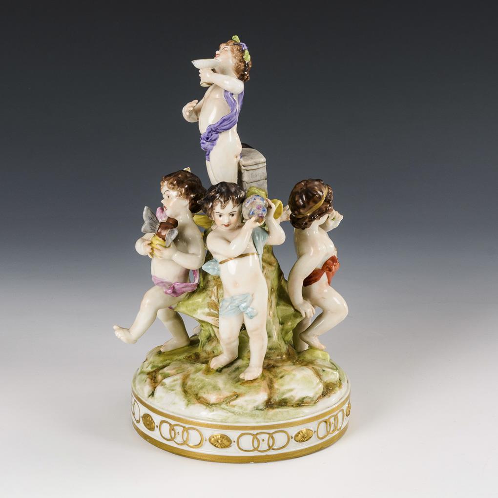 Gruppe von fünf Putten mit Spiegel, Muschel, Trinkschale, Hornisse und Blume. Blüte und 1 Finger bestoßen.