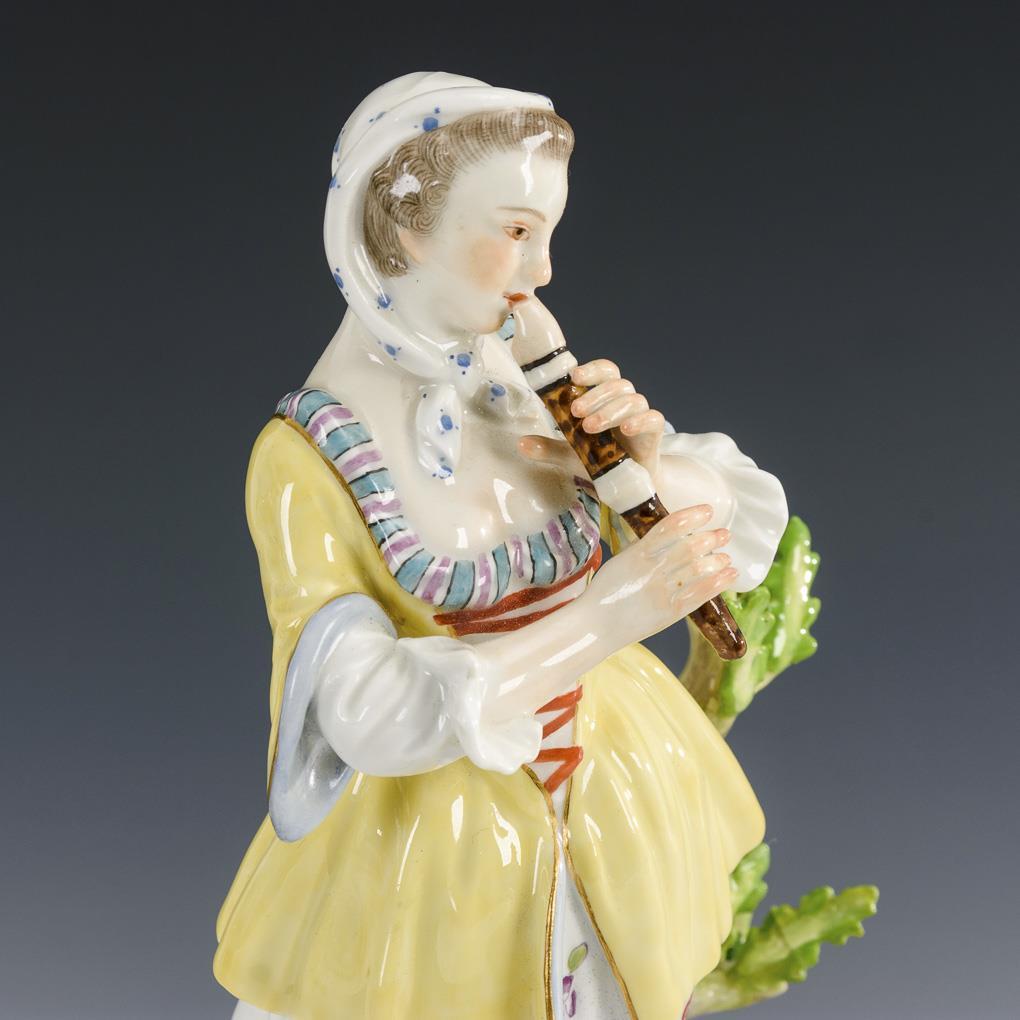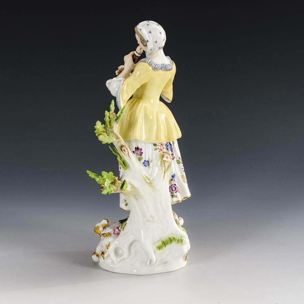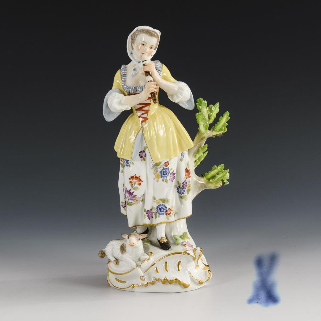 An einem Eichenbäumchen stehende, eine Flöte spielende Schäferin, zu ihren Füßen ein Lamm liegend. Flöte und Eichenblätter restauriert, 2 Blätter geklebt, 1 Eichenblatt fehlt.