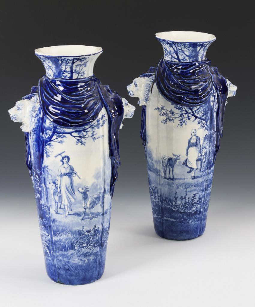 Schlanke Balustervasen mit vertikal gerillter Wandung, Löwenkopfhandhaben und aufgelegten Tüchern. Schauseitig jeweils eine bäuerliche Figurendarstellung mit Tieren. Bestoßung an einem Rand, an den Ständen minimal gechipped.