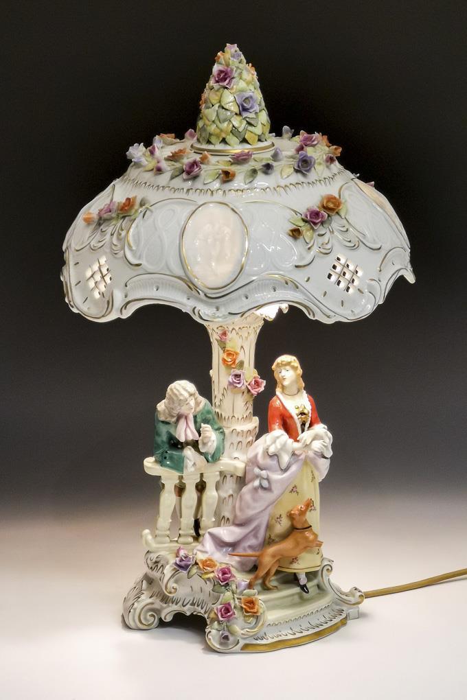 An einem blütenbelegten Palmenschaft stehendes Paar mit Hund, Lampenschirm mit Gitterdurchbrüchen, Blütenbelag und vier Lithophaniebildern, Knauf in Form eines Blumenbuketts. Elektrifiziert (funktionstüchtig). 2 Hundebeine fehlen, Bestoßungen am Belag.
