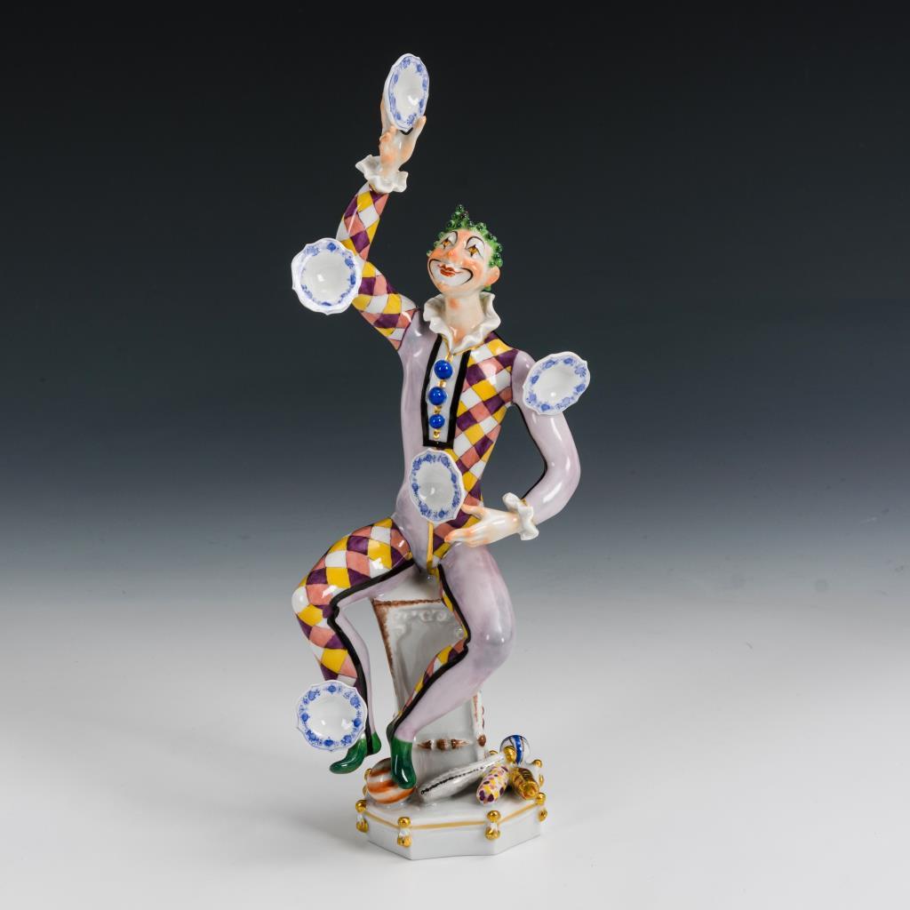 Sitzender, mit Zwiebelmustertellern jonglierender Clown.