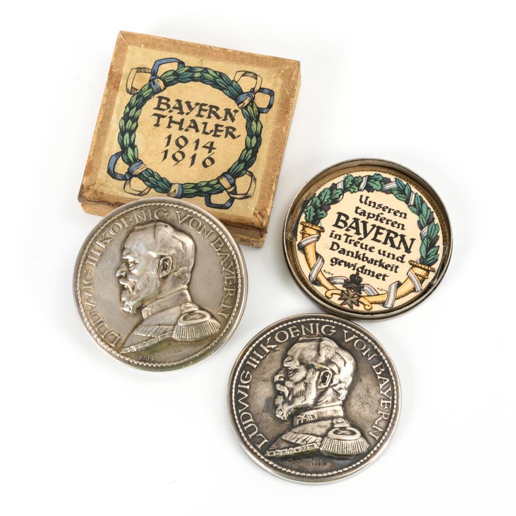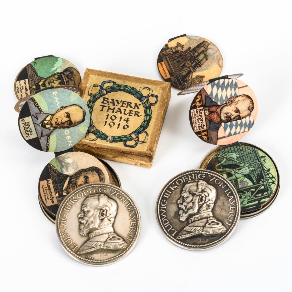 Silberner und versilberter "Bayernthaler 1814/1916". "Rich. Klein" bzw. Deschler M." bezeichnet. ø 5,2 cm. Zusammengesteckte "Schraubtaler", einer in der Original-Schachtel. Beide: Avers Bildnis "Ludwig III Koenig von Bayern". Innen mit weiß-blauem Rautenpapier ausgelegt sowie vollständige Leporello-Einlage mit 28 betitelten Farblithographien . Alters- und Gebrauchsspuren an der Schachtel.