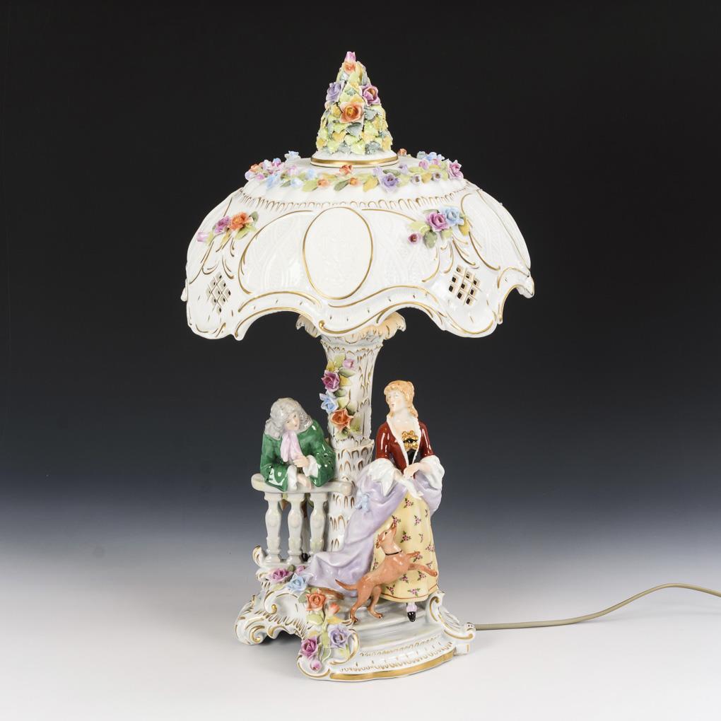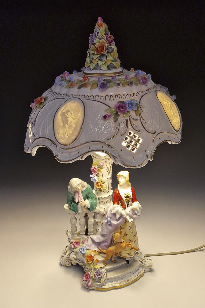 An einem blütenbelegten Palmenschaft stehendes Paar mit Hund, Lampenschirm mit Gitterdurchbrüchen, Blütenbelag und vier Lithophaniebildern, Knauf in Form eines Blumenbuketts. Elektrifiziert (funktionstüchtig). Schirm und Knauf nicht befestigt, Blüten minimal bestoßen, kurzer Haarriss am Schirm, 1 Hundebein geklebt, 2 Hundebeine und Hundeschwanz restauriert, 1 Lampenfassung defekt.