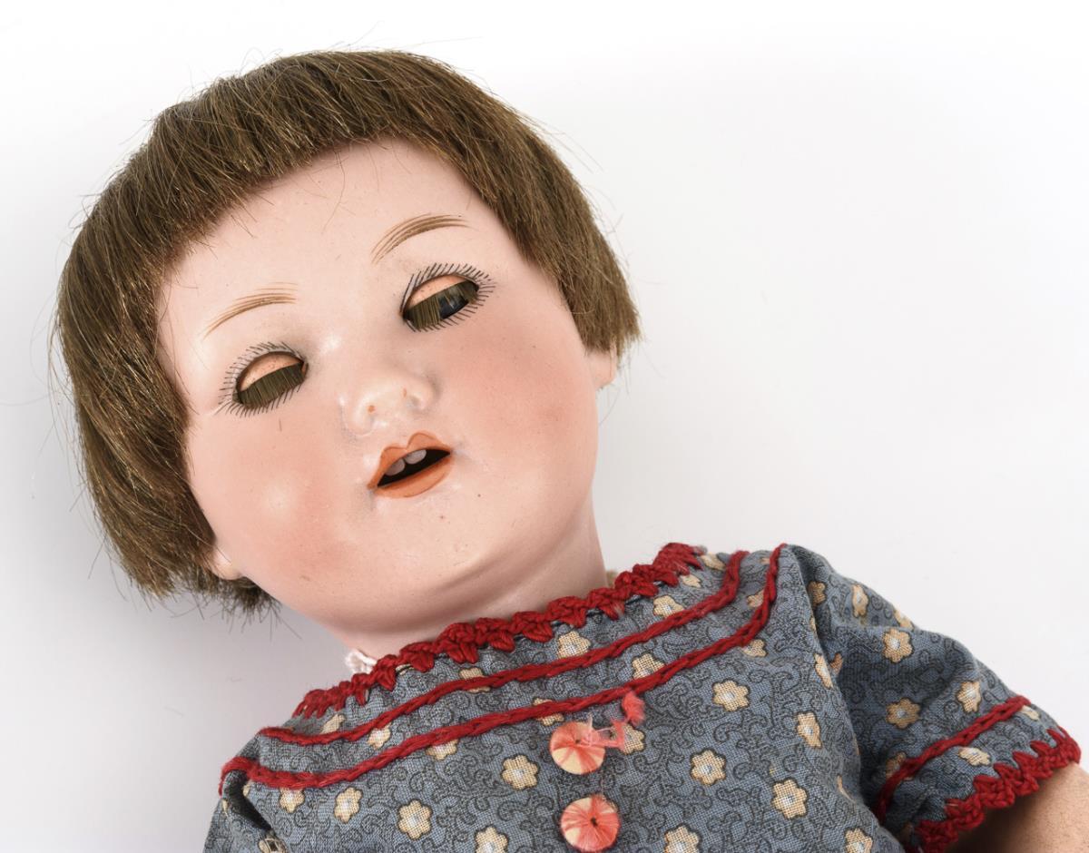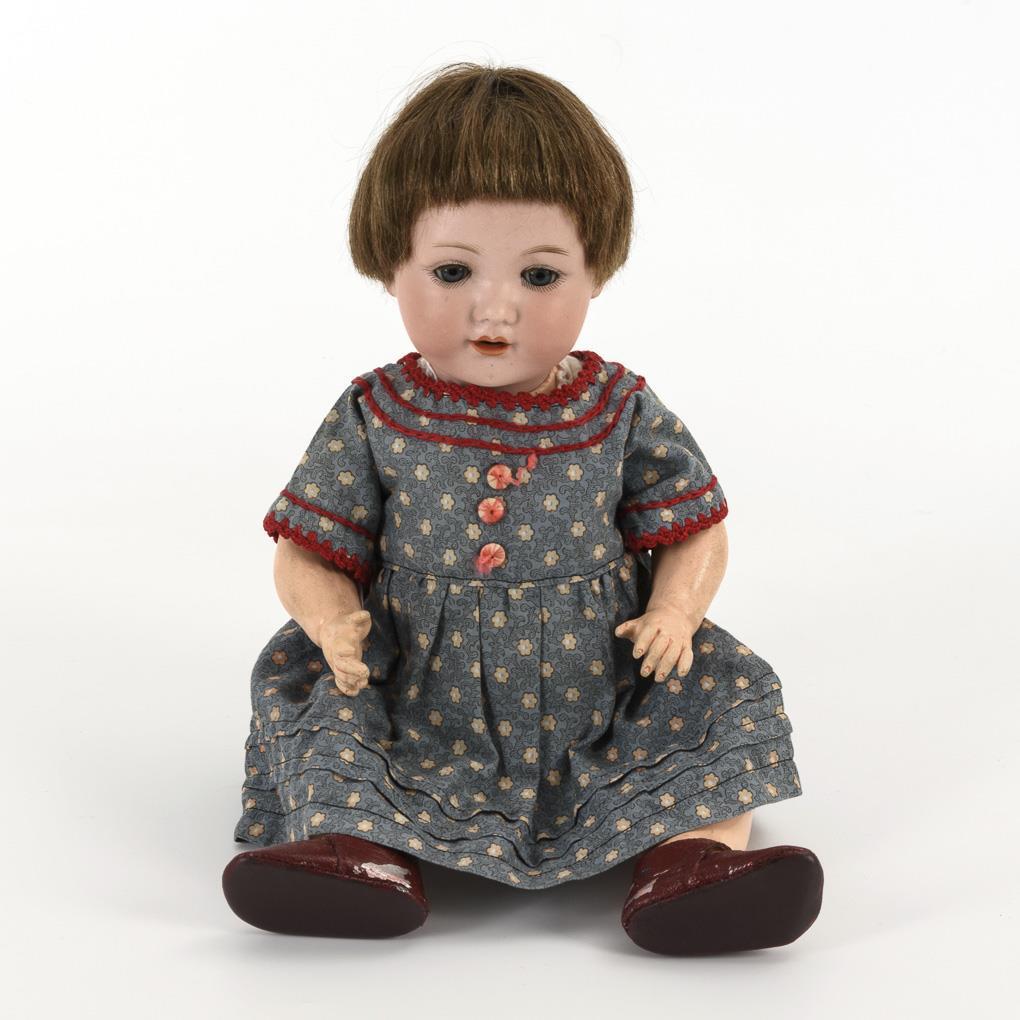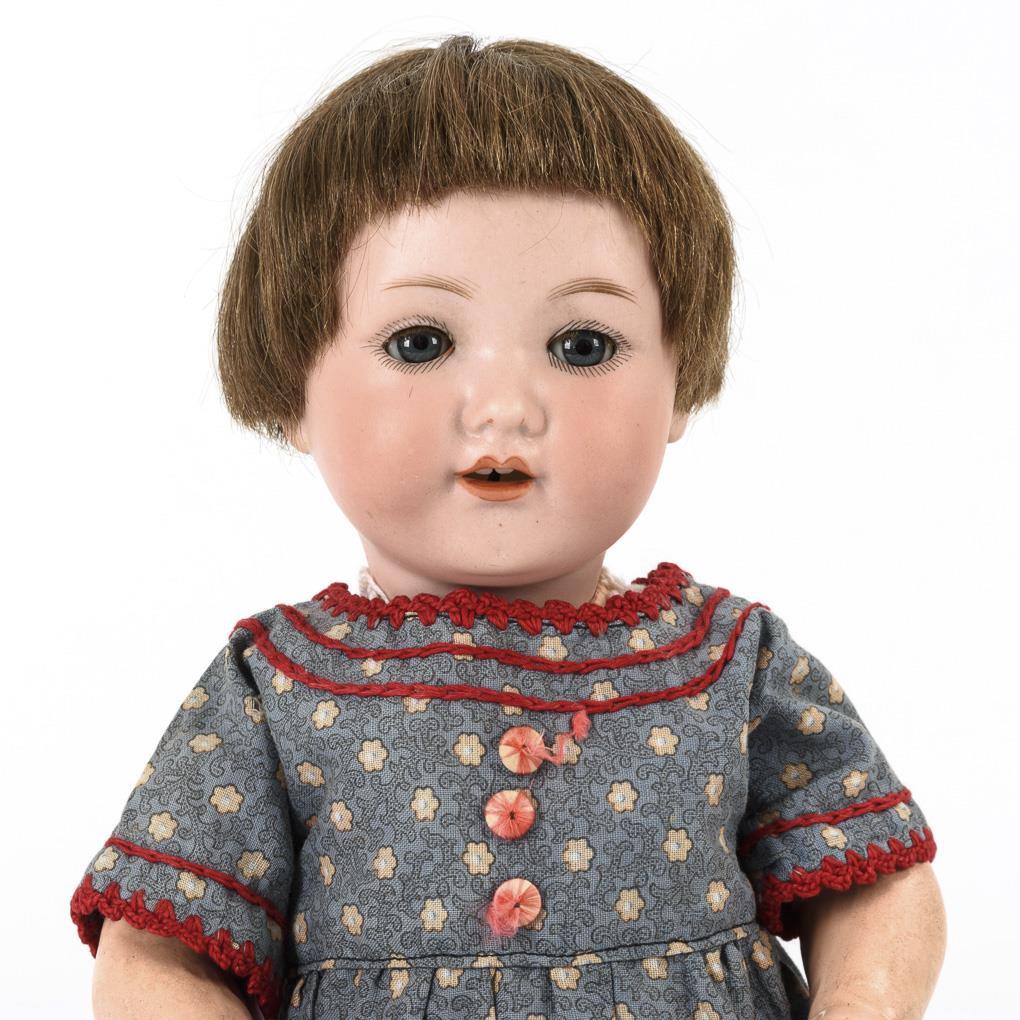 Kurbelkopf, blaue Schlafaugen, Wimpern, hellbraune Echthaarperücke. 5-teiliger Sitzbabykörper. Blau gemustertes Kleid mit roten Borten, rotbraune Schuhe. Perücke fest: Kopf nicht durchleuchtet, jedoch ohne sichtbare Defekte.