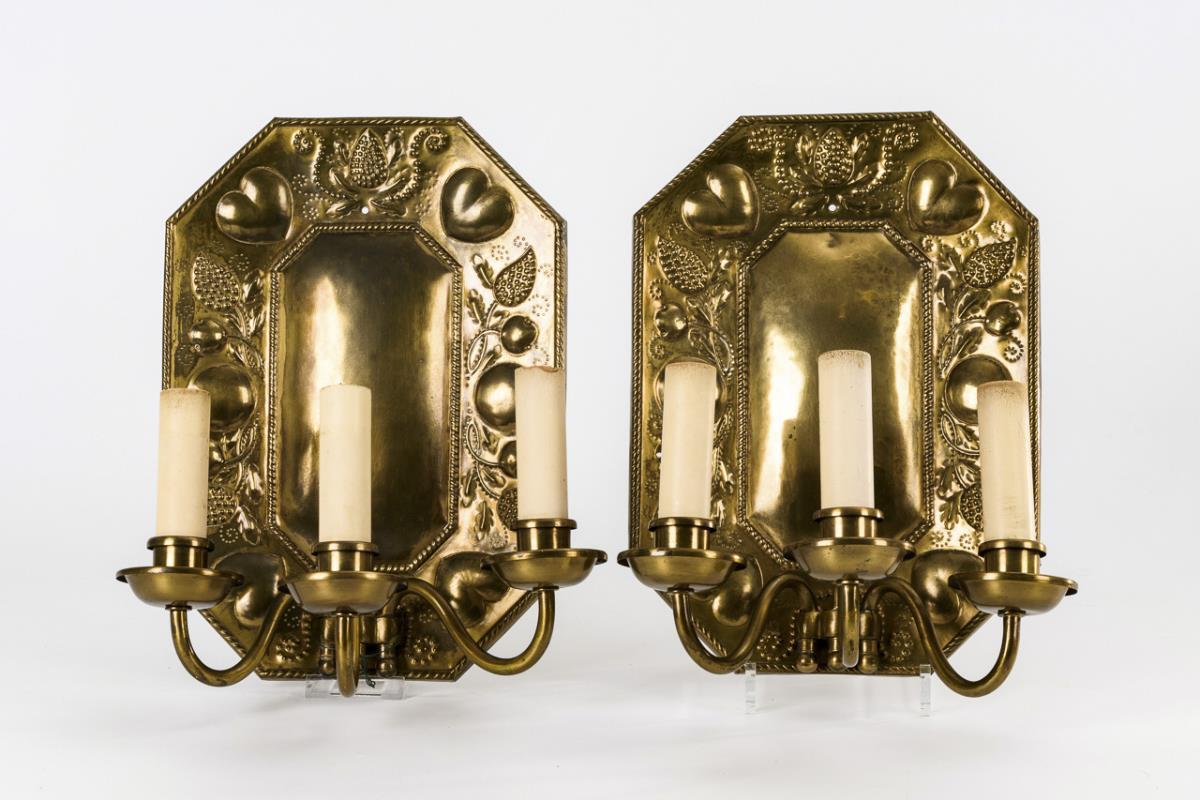 Dekorativ verzierte Wandbleche mit zentraler Wölbung, 3 Arme mit elektrischen Kerzen. Wenige Alters-/Gebrauchsspuren.