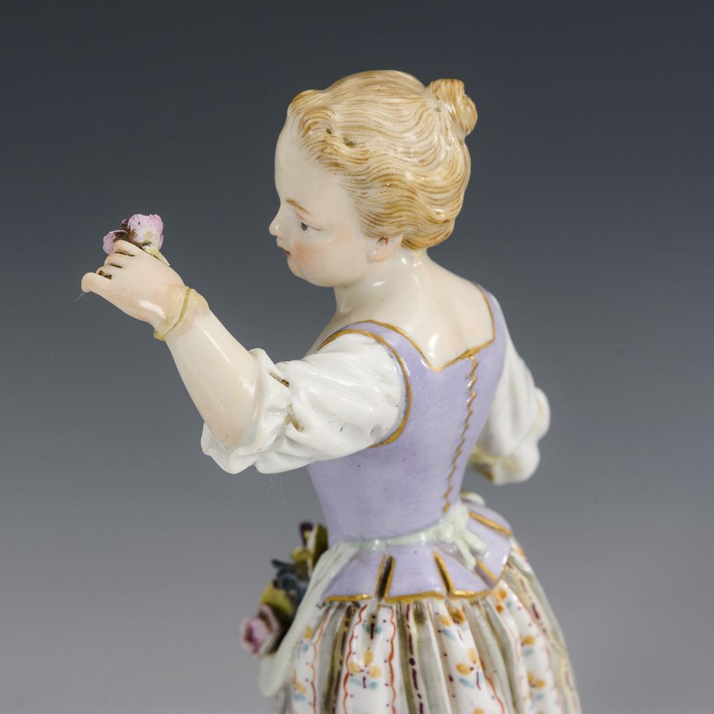 Auf einem Rocaillesockel stehendes Mädchen mit blütengefüllter Schürze. Bestoßungen an Blüten und Blättern, linke Hand geklebt.