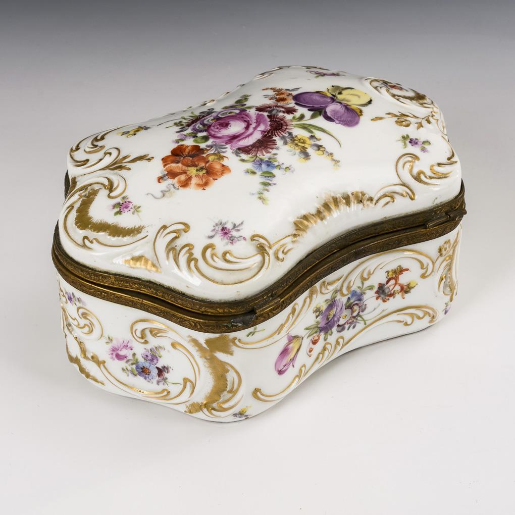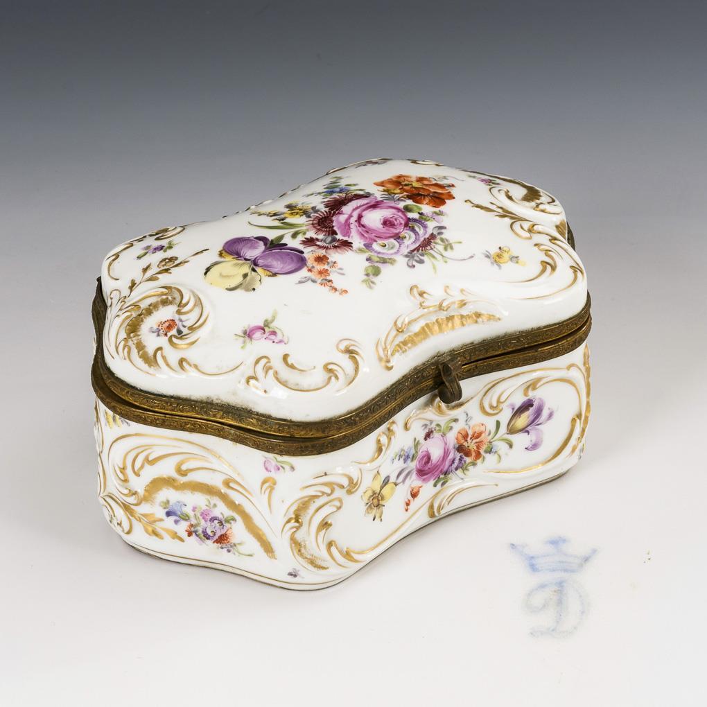Sechspassige Dose mit Rocaillerelief und metallmontiertem Scharnierdeckel. Allseitig gemalte Blumenbuketts und Streublümchen. 1 Scharnier defekt, im Deckel kleine Haarrissspinne in der Glasur.