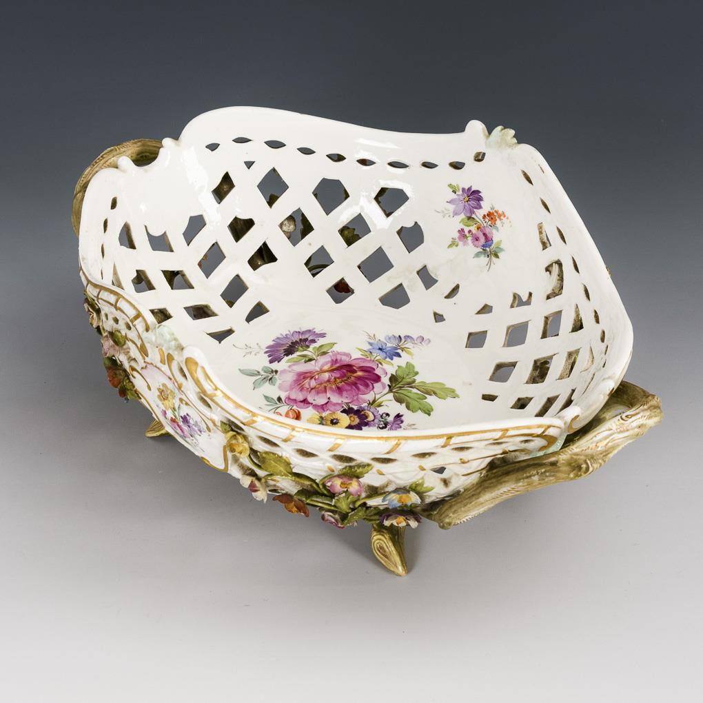 Ovaler Korb mit 4 Astfüßen, 2 Asthenkeln, reichem Blütenbelag und Blumenmalerei. Bestoßungen am Belag und an 1 Fußspitze.