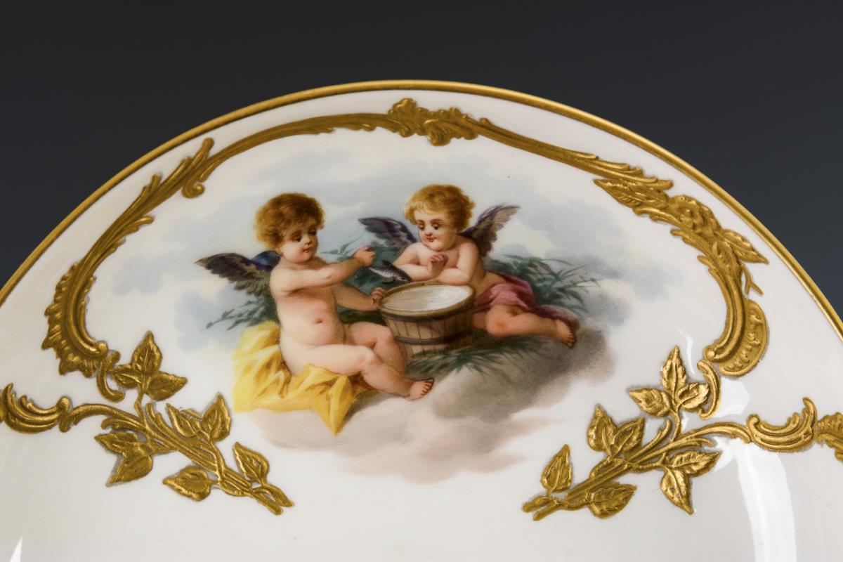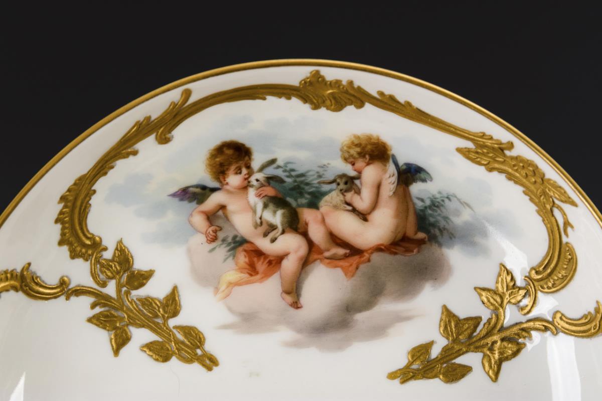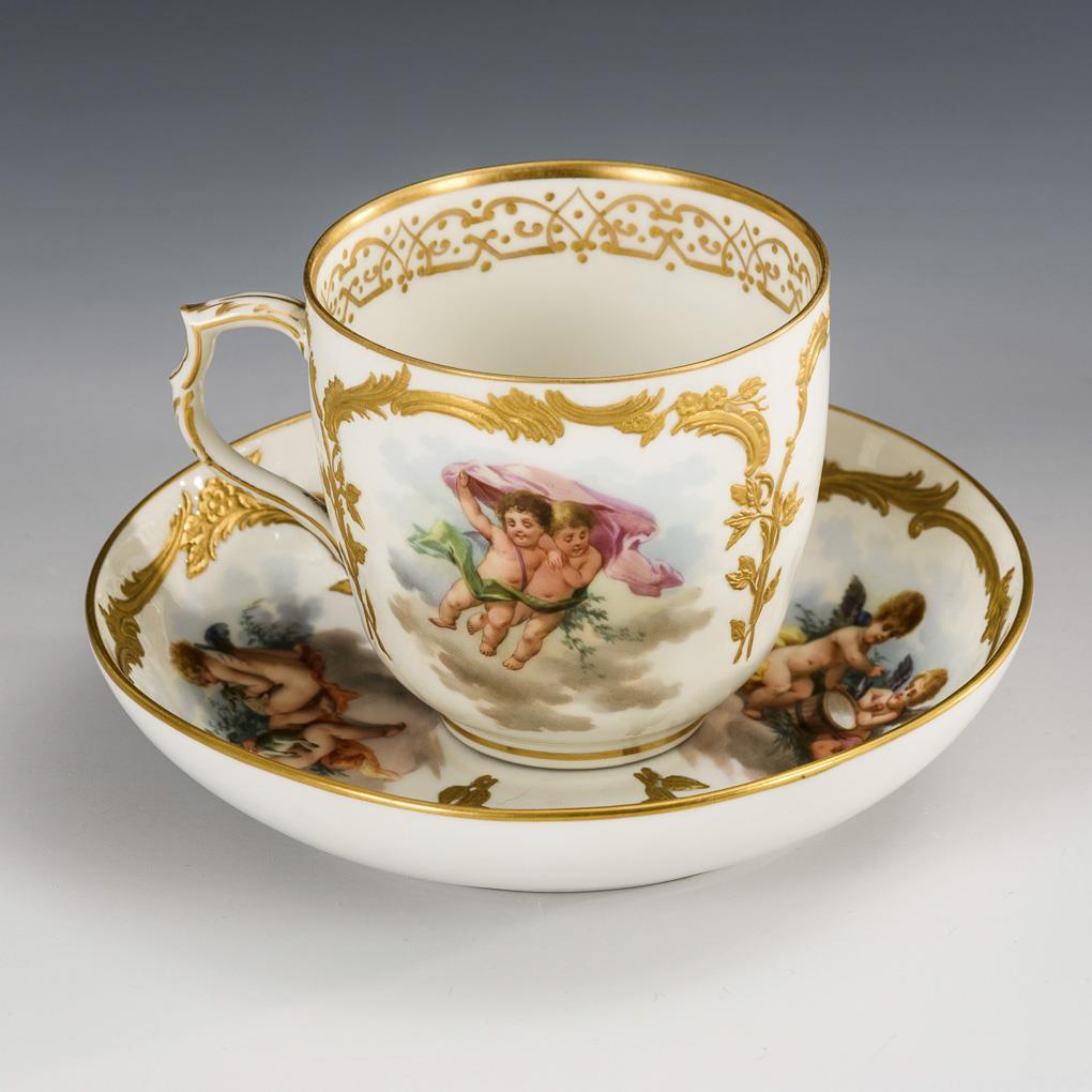 Modell "Neuzierat". Auf der Tasse und der Untertasse jeweils fein gemalte Darstellungen von Wolkeninseln mit Puttenpaaren, nach Motiven der Fliegenden Kinder nach Francois Boucher (1703-1770).