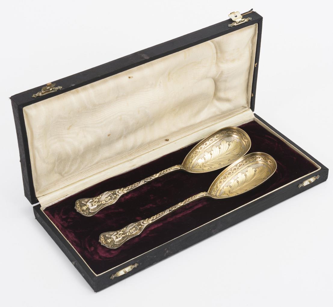 2 silberne Vorlegelöffel in Etui. Martin, Hall & Co., Sheffield und London.
