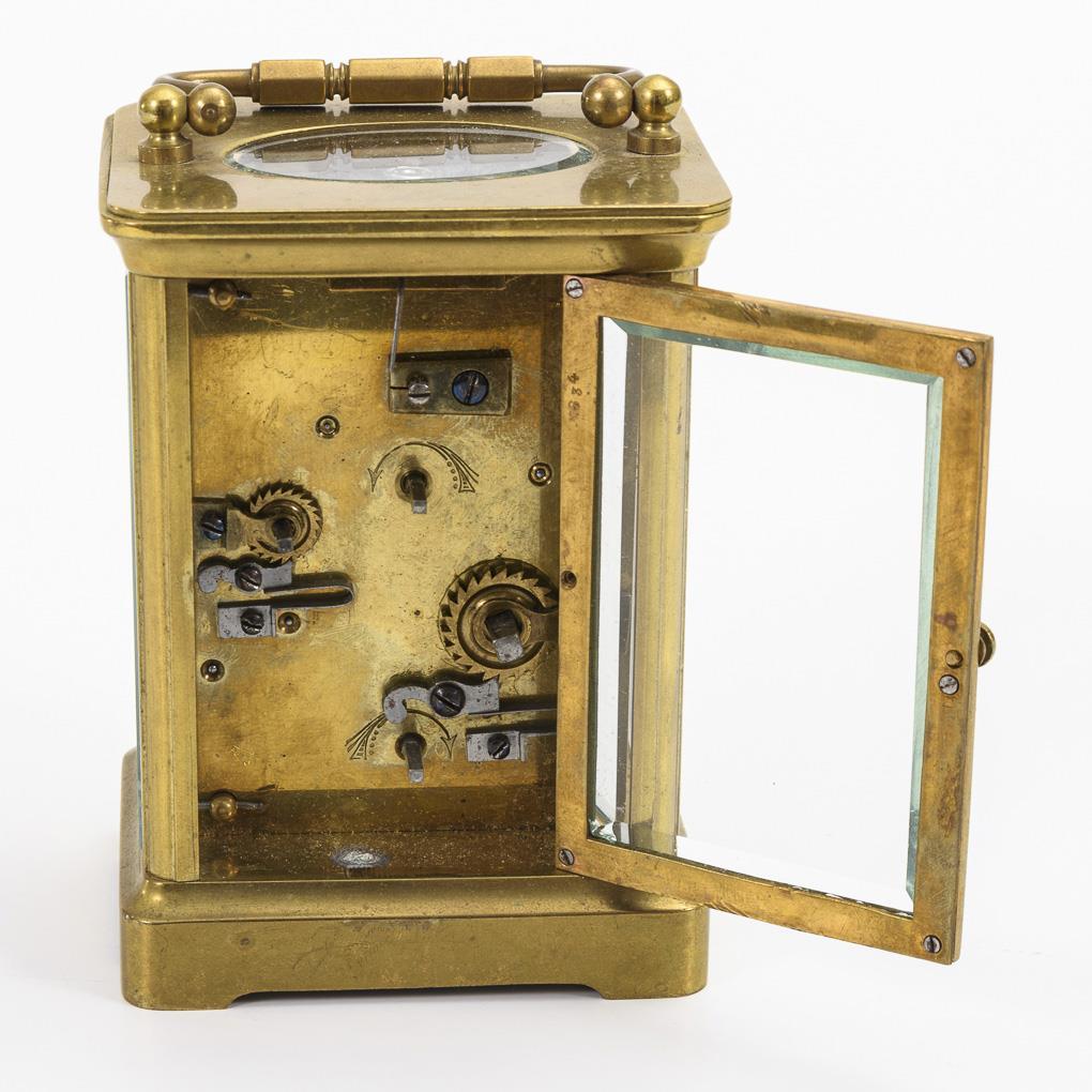 Ungemarktes Werk mit Zylindergang, Weckwerk mit Bodenglocke, läuft. Weißes Emailzifferblatt mit römischen Zahlen, Minutenkranz und gebläuten Zeigern, Hilfszifferblatt für Alarmfunktion.