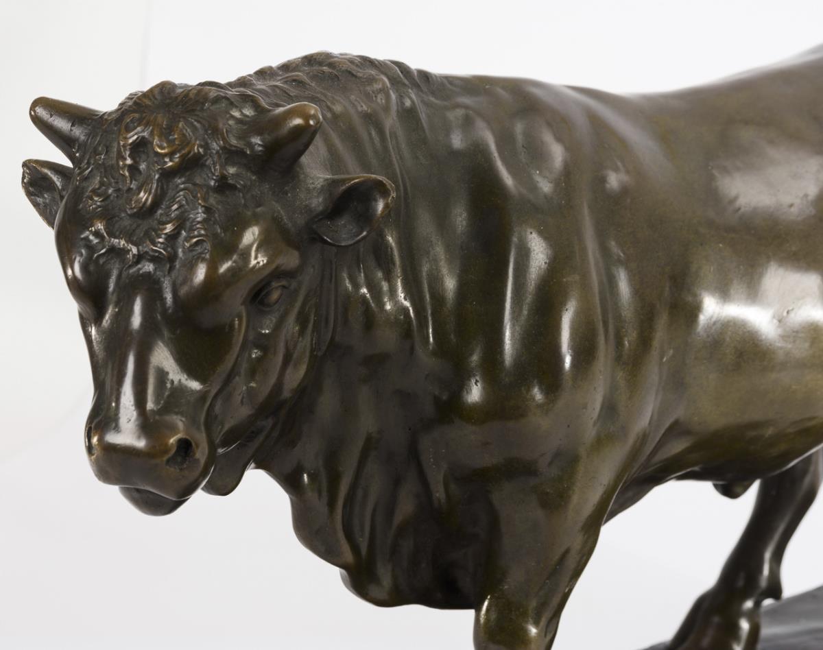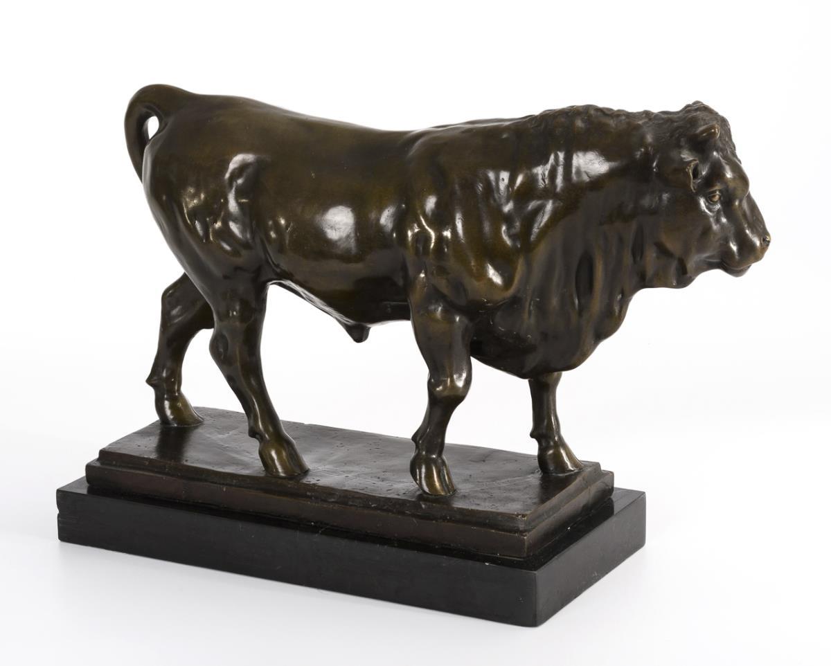 Prächtiger Stier mit leicht zur Seite gewendetem Kopf. Etwas fleckige Patina, Marmor ausgebessert (Bronze-Plinthe teils schwarz lackiert).
