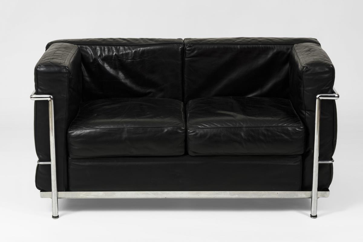 2-Sitzer-Sofa aus der LC-Reihe in kubischem Design mit Stahlgestell und Lederauflagen - Entwurf von Le Corbusier, Pierre Jeanneret und Charlotte Perriand im Jahr 1928; gehört zu den berühmtesten Modellen der LC-Reihe