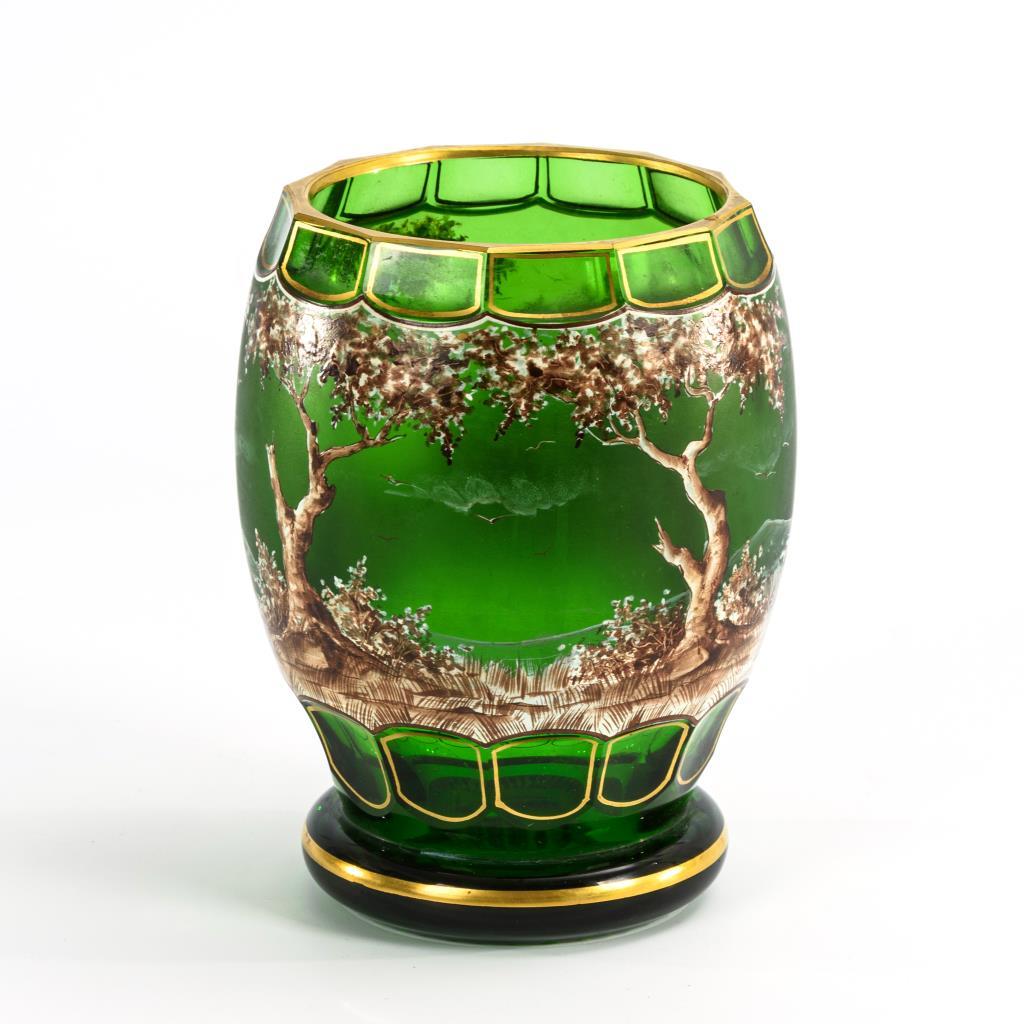 Grünes Glas, Malerei in Braun und Weiß, Goldstaffage.H 17 cm.