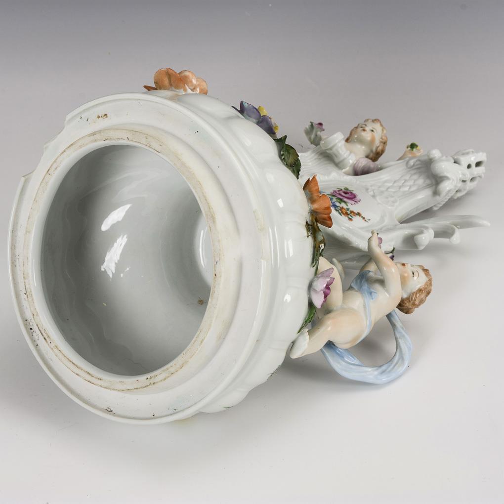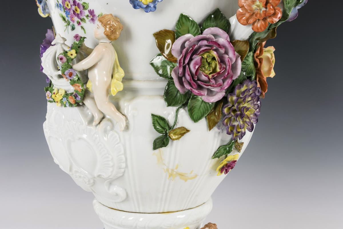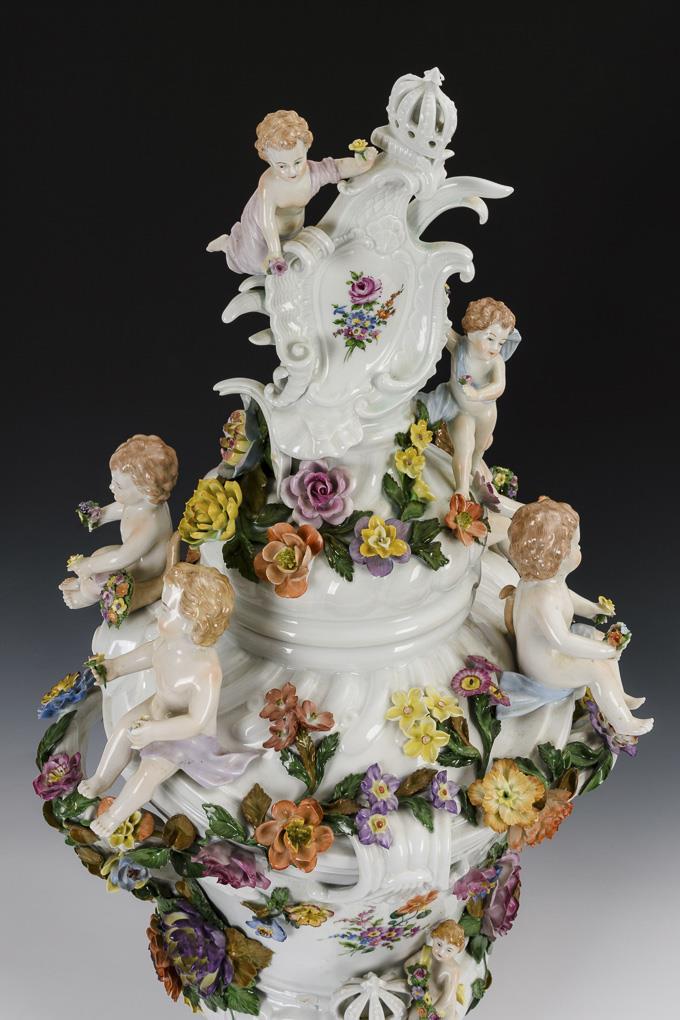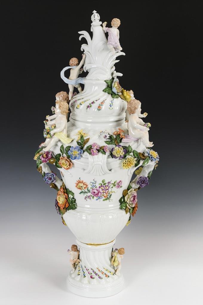 Reich mit Blüten belegte Balustervase mit zahlreichen Putten, Deckel mit einem von Putten gehaltenen Wappenschild als Knauf. Defekt.