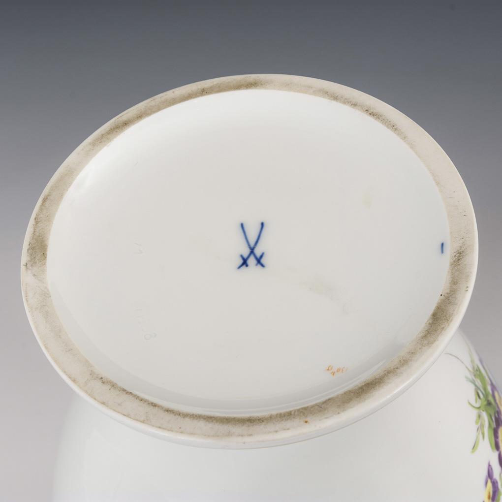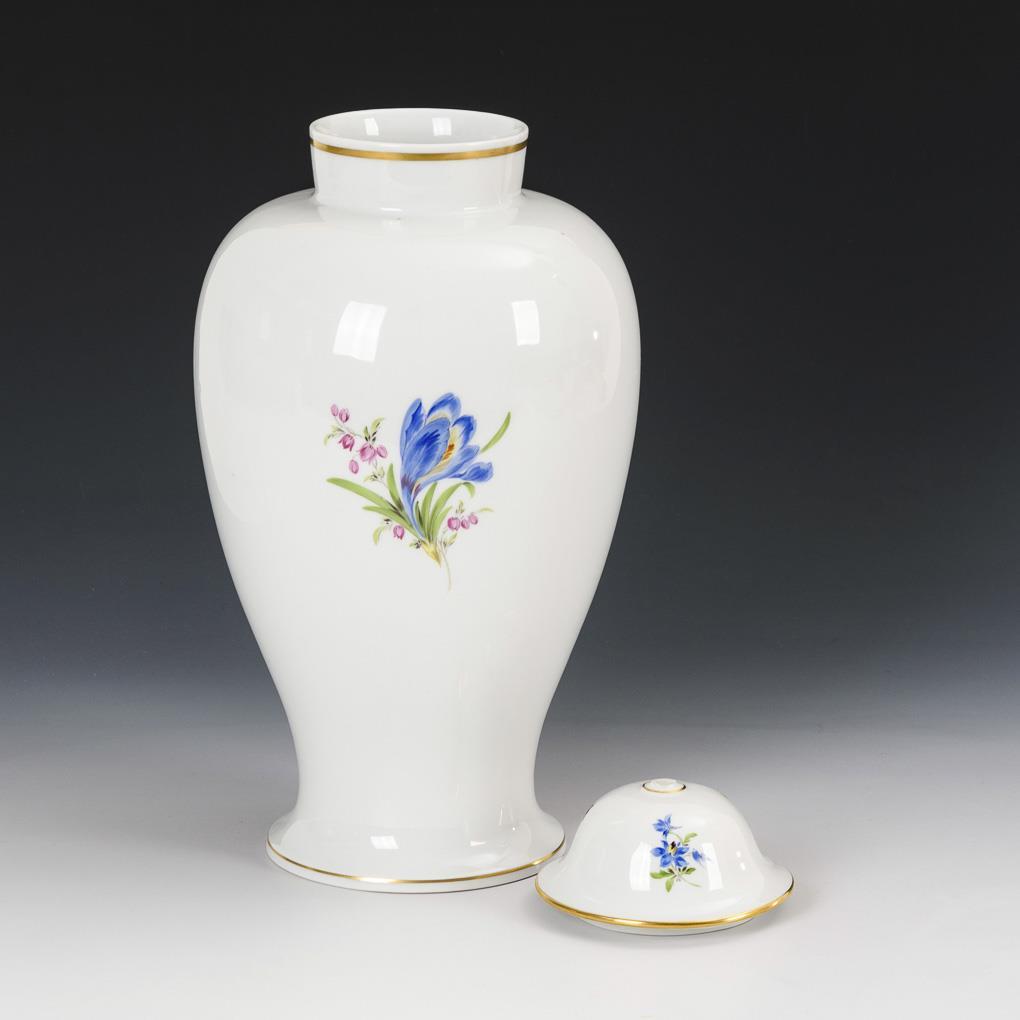 Balustervase mit einem schauseitigen Blumenbukett mit Iris und Mohn. Deckelknauf fehlt.