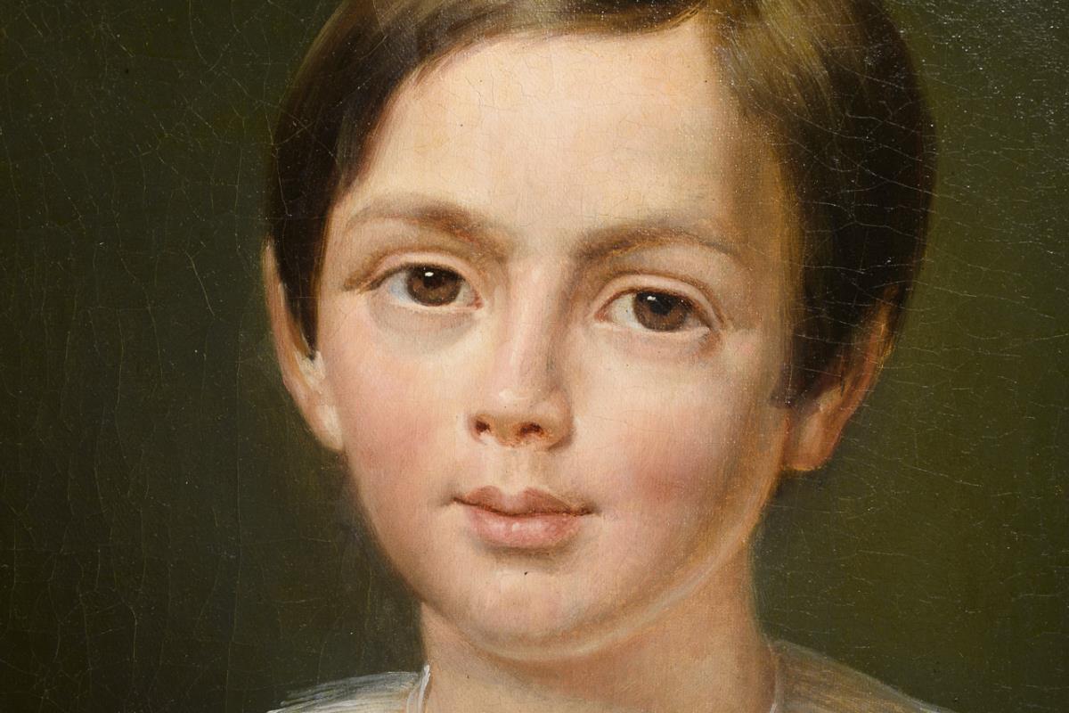 Porträt eines Jungen in schwarzer Kleidung mit Blumenkranz und Buch. Kleine Defekte.