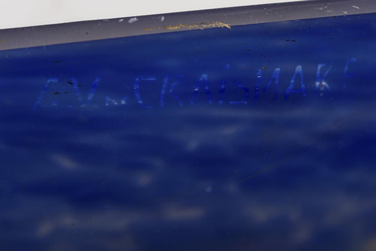 Farbloses, mattiertes Glas mit blauen und orangefarbenen Pulvereinschmelzungen, verchromtes Metall. L ca. 82 cm, Ø ca. 35 cm.