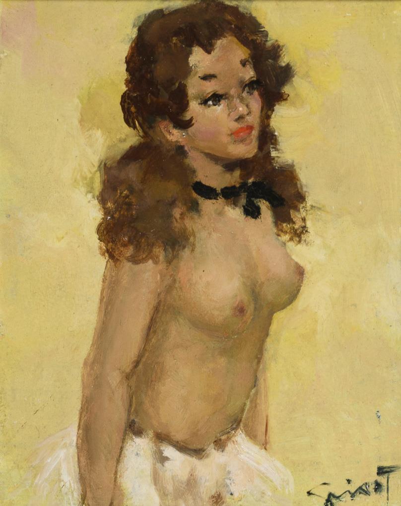 Bildnis einer jungen, nackten Frau vor gelbem Hintergrund.