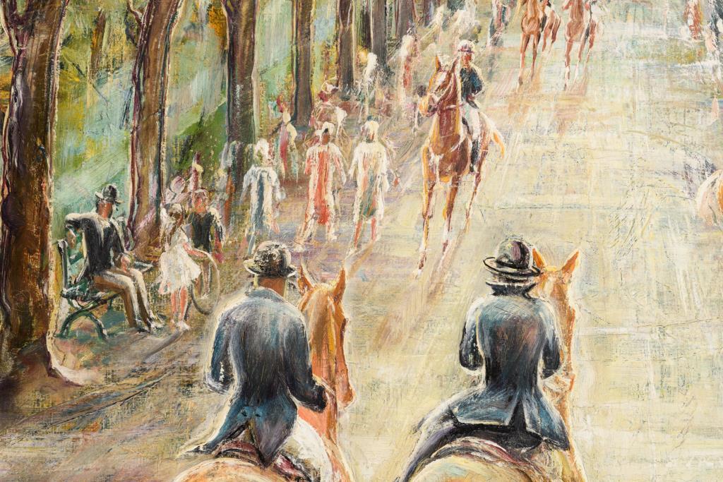 Viele Reiter im Galopp auf der breiten Allee. Leichte Altersspuren.