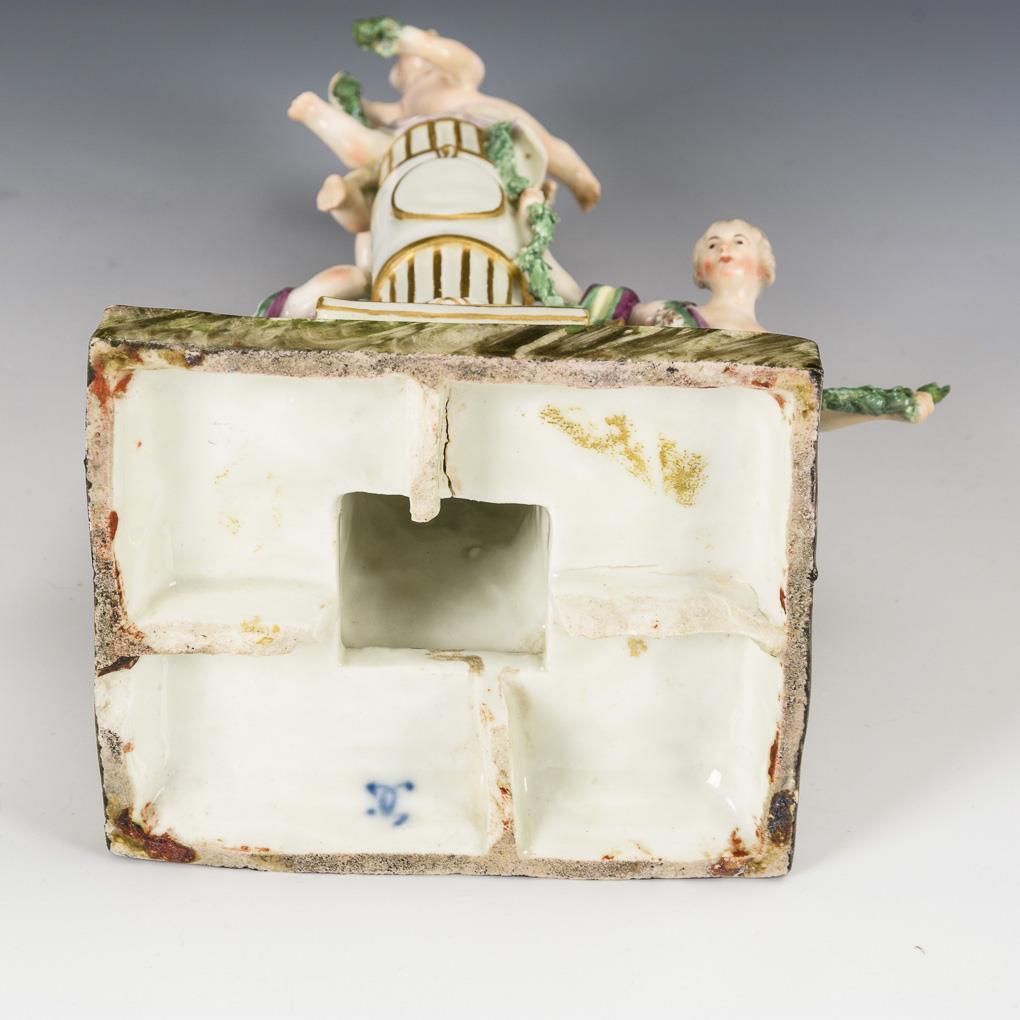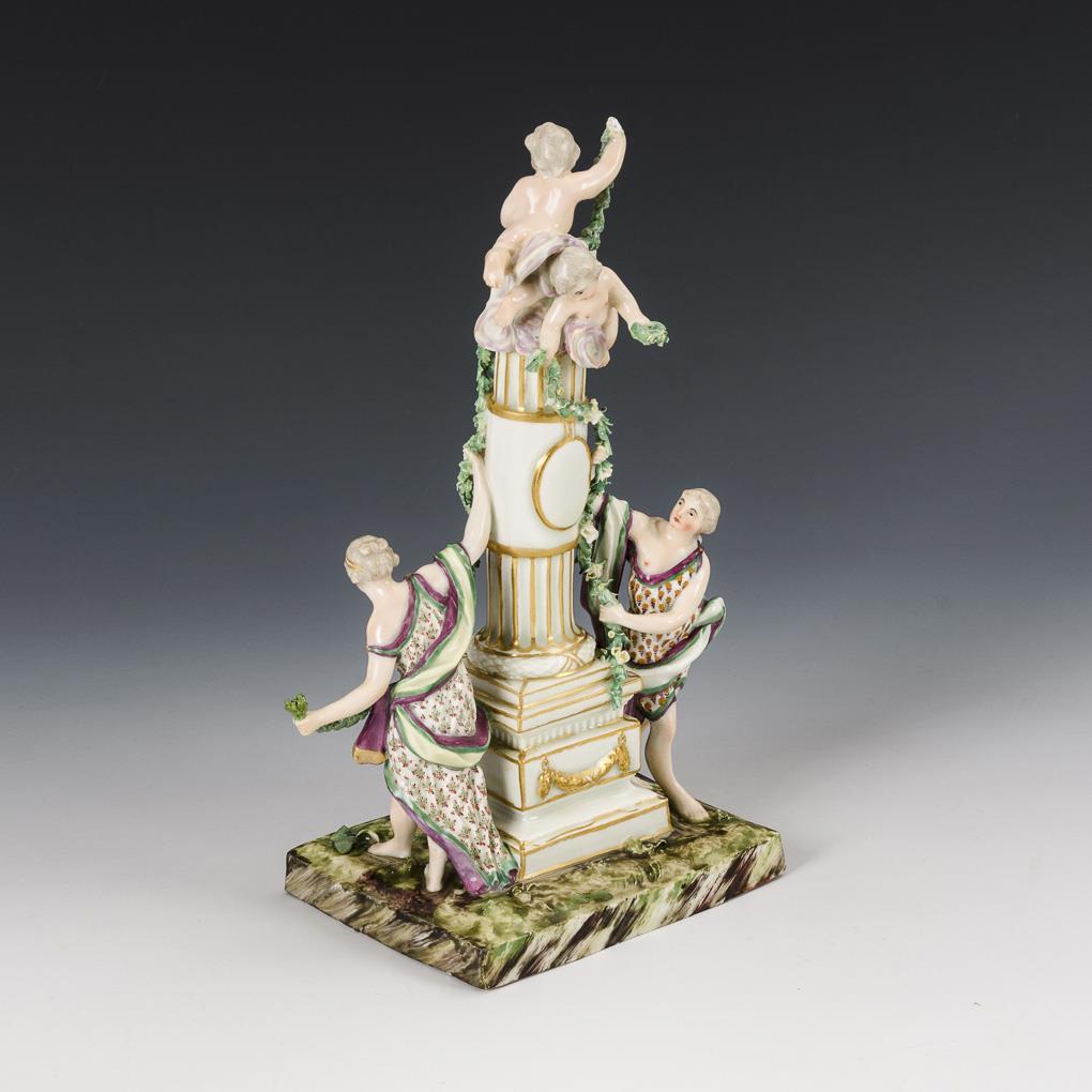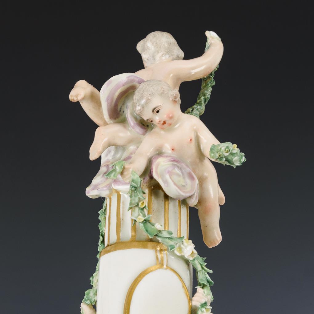 Zwei an einer von zwei Putten bekrönten Säule stehende Frauen mit Girlande. Unterseitig Brandriss im Sockel und Bestoßung an 1 Steg, Putto sowie Girlande restauriert und mit Bestoßungen.